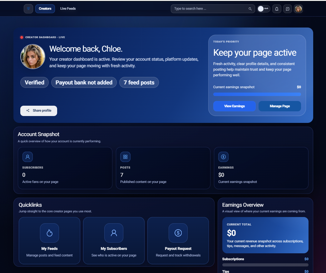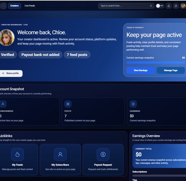 The updated dashboard is designed to give creators a simple, immediate view of their account. Instead of digging through menus, everything important is visible straight away, including account status, verification progress, activity levels, earnings snapshot, and quick access to key actions like managing your page or viewing earnings. This removes guesswork and makes it easier to stay on top of your account.